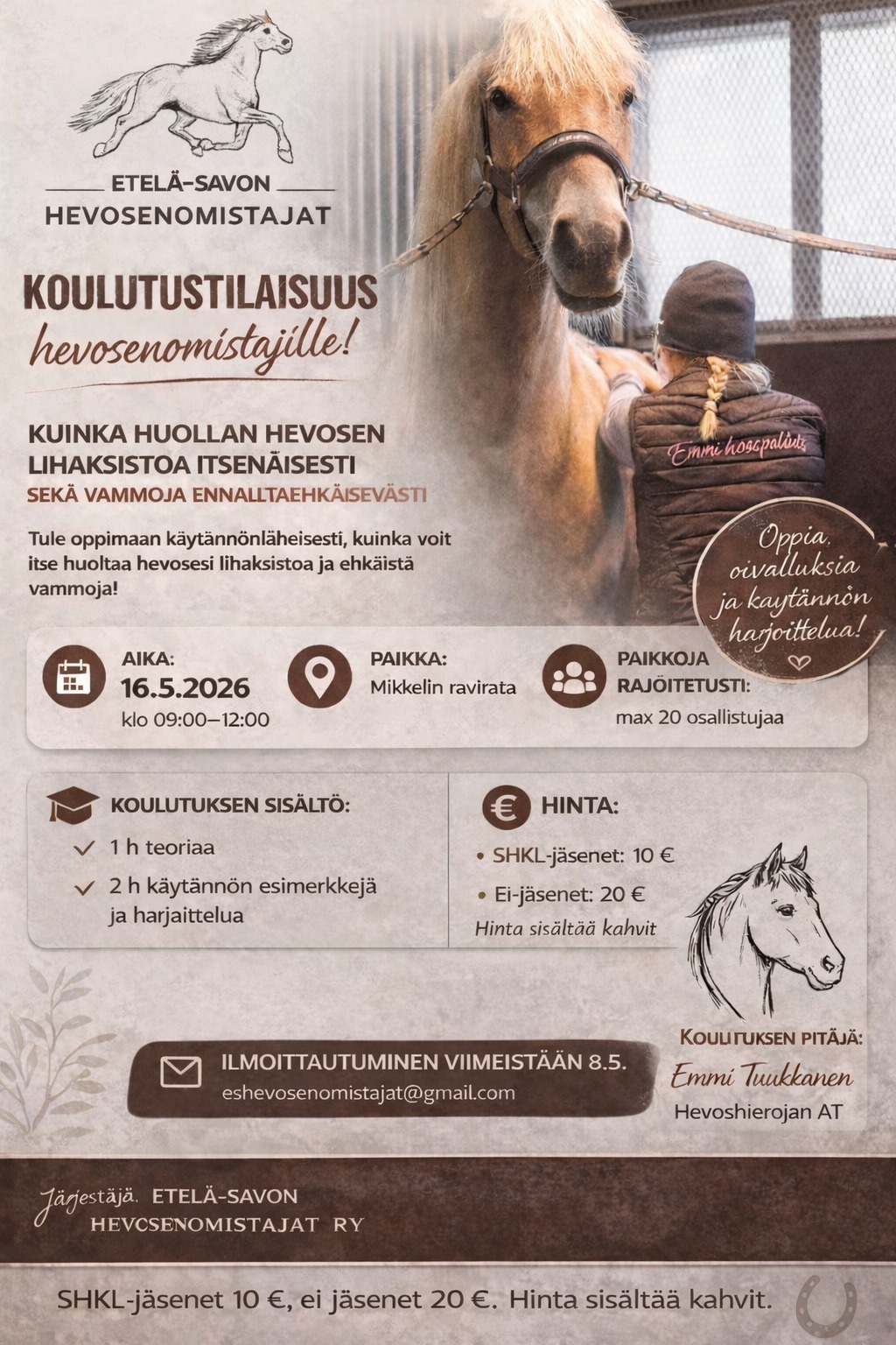 Ilmoittautuminen viimeistään 8.5.2026 sähköpostitse: eshevosenomistajat@gmail.com