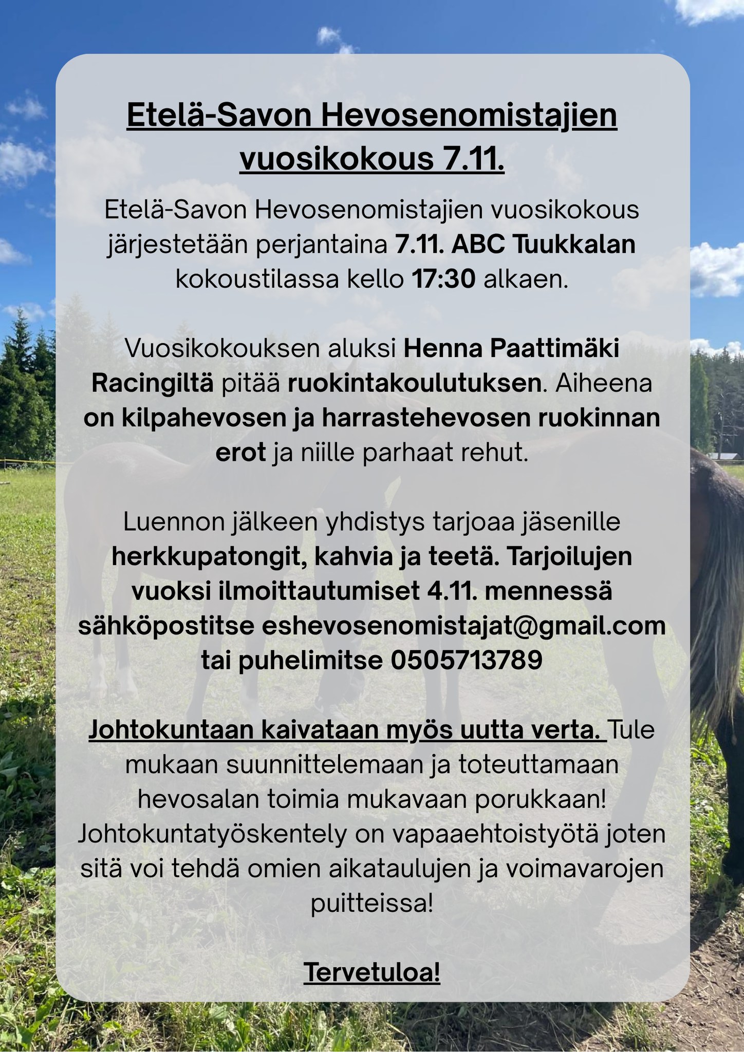 Etelä-Savon Hevosenomistajien vuosikokous järjestetään perjantaina 7.11.2025 ABC Tuukkalan kokoustilassa Mikkelissä (Annilantie 2, 50500 Mikkeli) klo 17.30 alkaen.