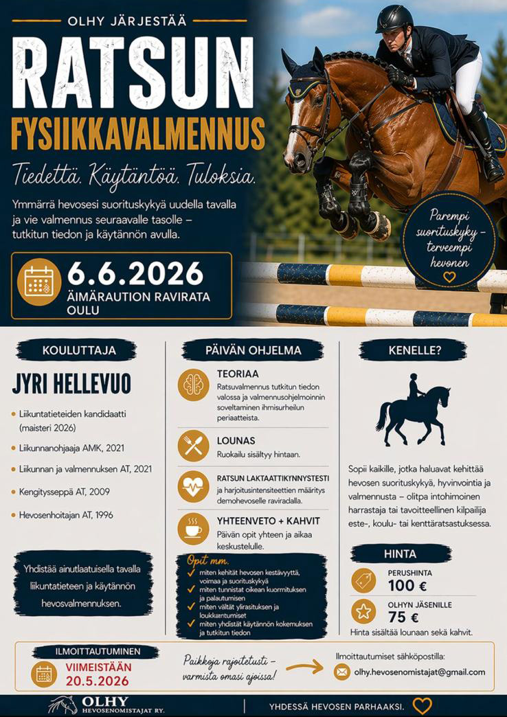 Hinta: Perushinta 100 €, OLHY-Hevosenomistajat ry:n jäsenille (SHKL:n jäsen OLHY:n alueella) 75 €. Hinta sisältää lounaan sekä kahvit.