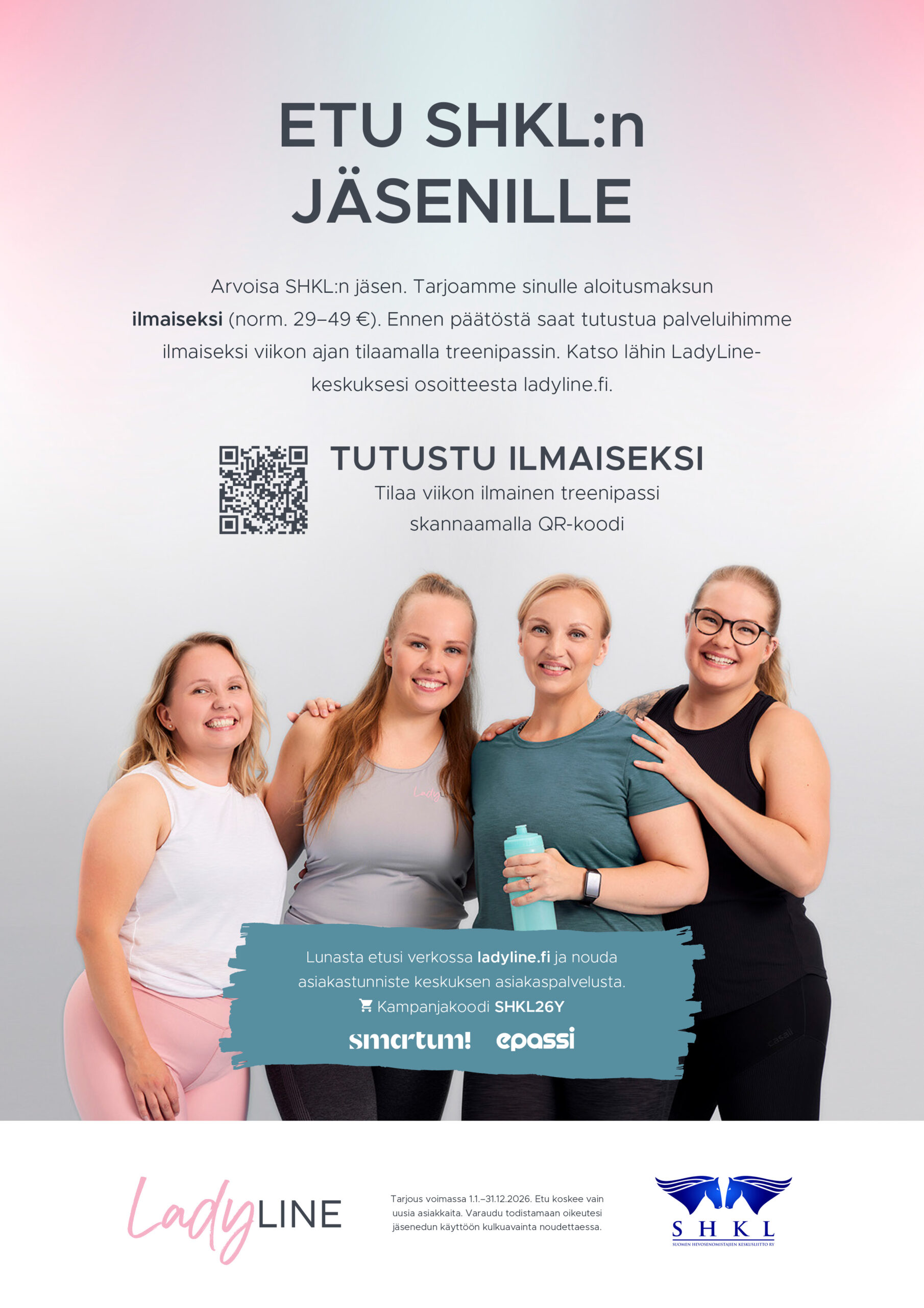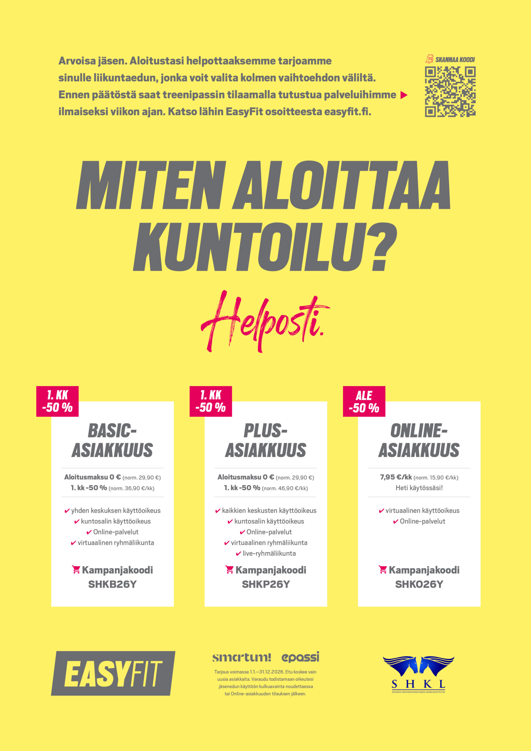 - Tilaukset osoitteessa kauppa.hevosurheilu.fi/shkl. Käytä tilatessasi kampanjakoodia shkl26