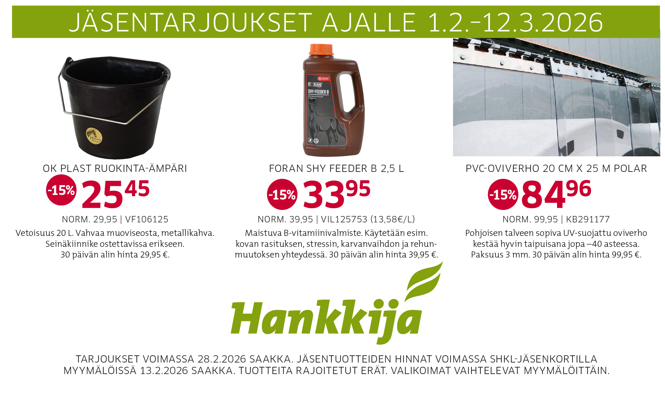 Vaihtuvat jäsenedut Hankkijan myymälöistä. Alennustuotteet esitellään Hevosenomistaja-lehdessä.